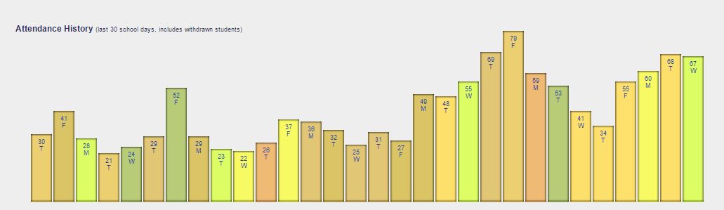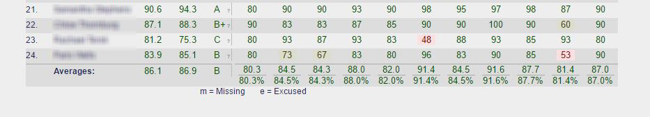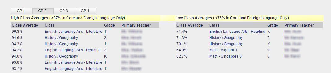 Average class grades that are either too high or too low are highlighted (optional parameters set by administration), as are classes with missing grades.