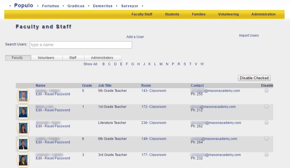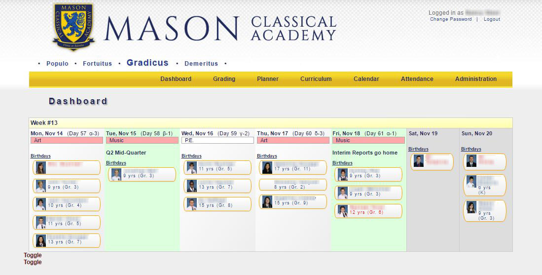 18. Parent Portal: The Gradicus Parent Portal allows parents to access much of the available information about their own children, including grades, assignment and test scores, schedules, attendance history, discipline history (demerits), subject curricula, as well as enter volunteer hours and view their volunteering history.
