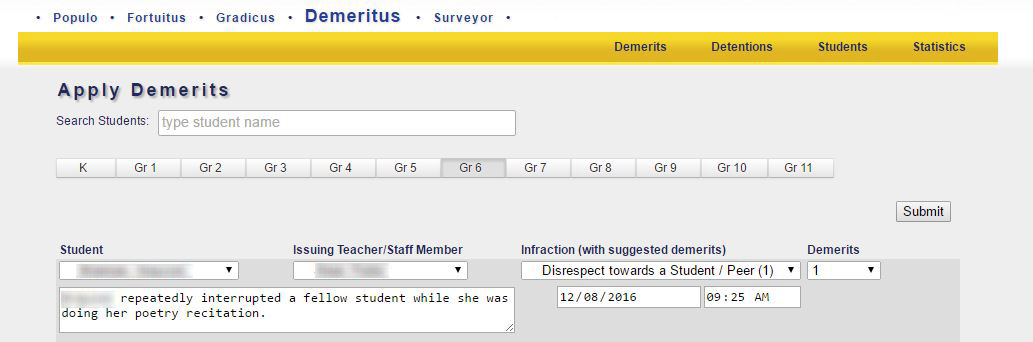 8. Admin Dashboard - Top 20 Demerit Earners: If Demeritus is used, the top 20 demerit earning studenst are displayed on the administration dashboard. Within days of the start of the school, administrators can identify those students who will need intervention strategies in order to have a successful year. The progress of the students' behavior can then be monitored easily and closely on a daily basis.