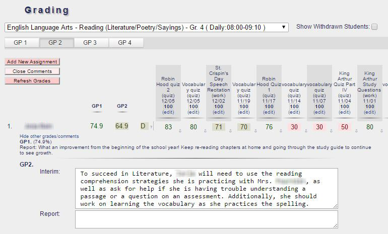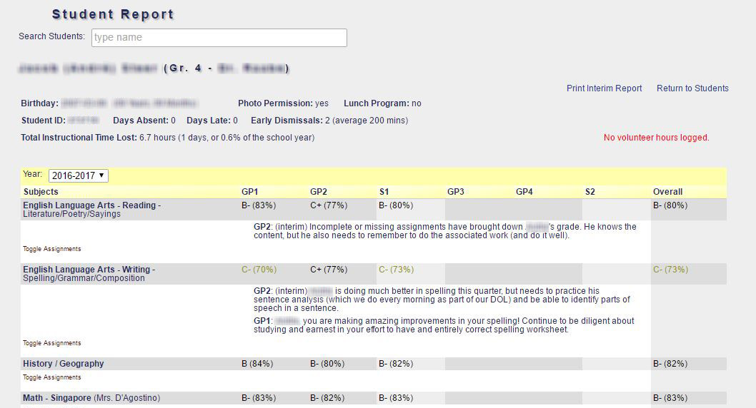 15. Grading - Student Report: A comprehensive report can be viewed for each student by teachers and administrators. This shows the student's current and past grades, teacher comments, and a listing of tests and assignments, broken down by grade weighting category.
