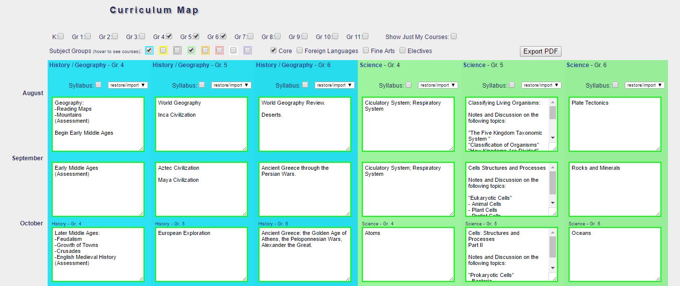 9. Planning - Curriculum: The curriculum map for each course is accessible by all teachers and administrators. Only administrators and teachers of that course can make modifications. The curriculum map is standardized in a monthly format or as a syllabus. They can be exported to a PDF.