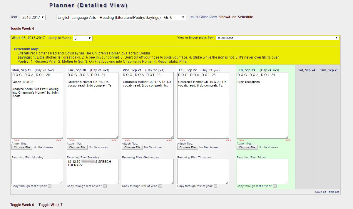 Teachers can also attach documents to lesson plans and display multiple weeks at the same time. Recurring plans are for lessons that repeat from week to week.